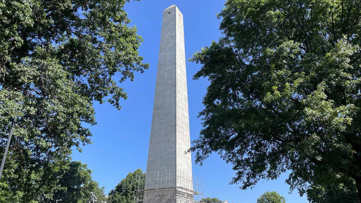 Members travel to Boston by steamboat and train to take part in the June 17 dedication of the Bunker Hill Monument.