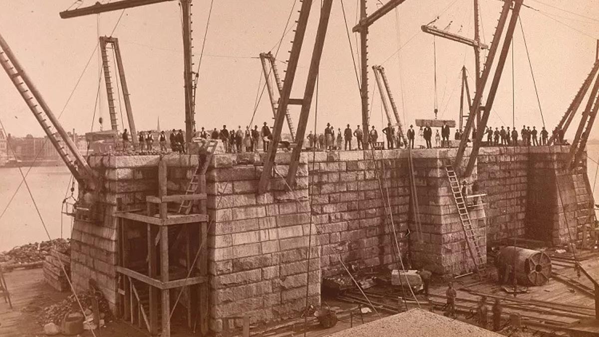 Construction begins on the Brooklyn Bridge.